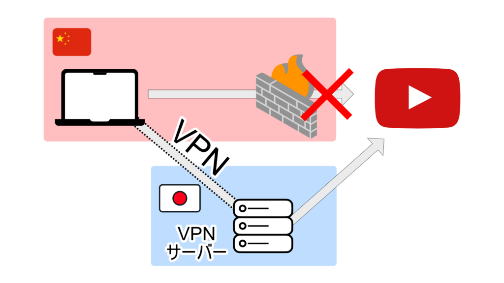 また、そのように別の地域にいるということにできるため、国の検閲を突破することができるようになります。例えば中国から日本を経由(日本サーバーにVPN接続)することでYouTubeを見たり、Instagram投稿をしたりできるようになるという具合です。