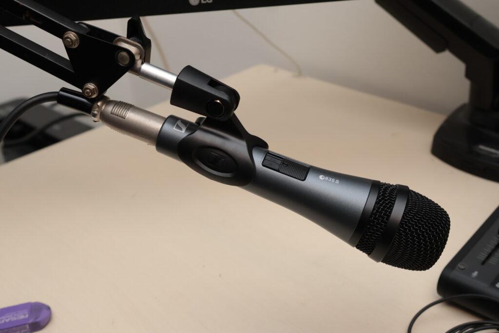 実際に使ってみると、声が非常に聞き取りやすく、音質も良好です。これまで使っていたAudio-TechnicaのAT2020はコンデンサーマイクのため、家の生活音や環境音をかなり拾ってしまっていましたが、e835はダイナミックマイクなので騒音下でもノイズをほとんど拾いません。