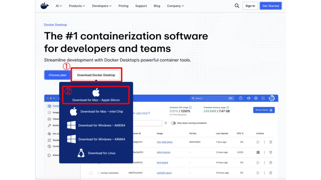 MacやWindowsではセットアップが簡単なDocker Desktopを使うことが多いため、この記事ではMacとWindowsでのDocker Desktopの導入方法を紹介します。