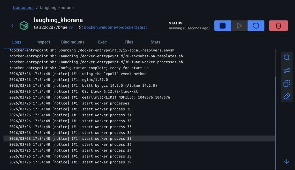 ダウンロードが完了しましたら、ひとまずコンテナを起動してみましょう!今回は動作確認によく使われるwelcome-to-dockerというコンテナを動かしてみます