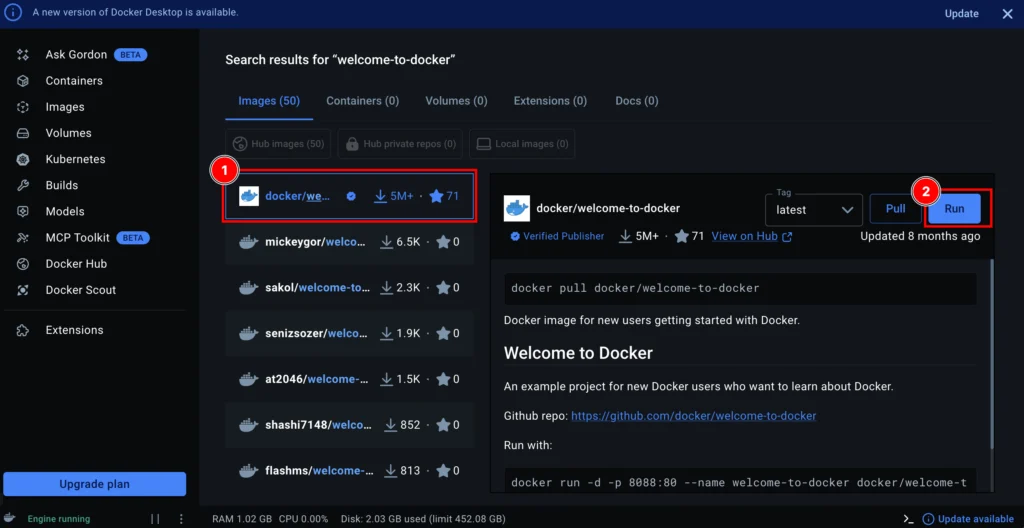 右上のSearchをクリックし、検索欄に「welcome-to-docker」と入力