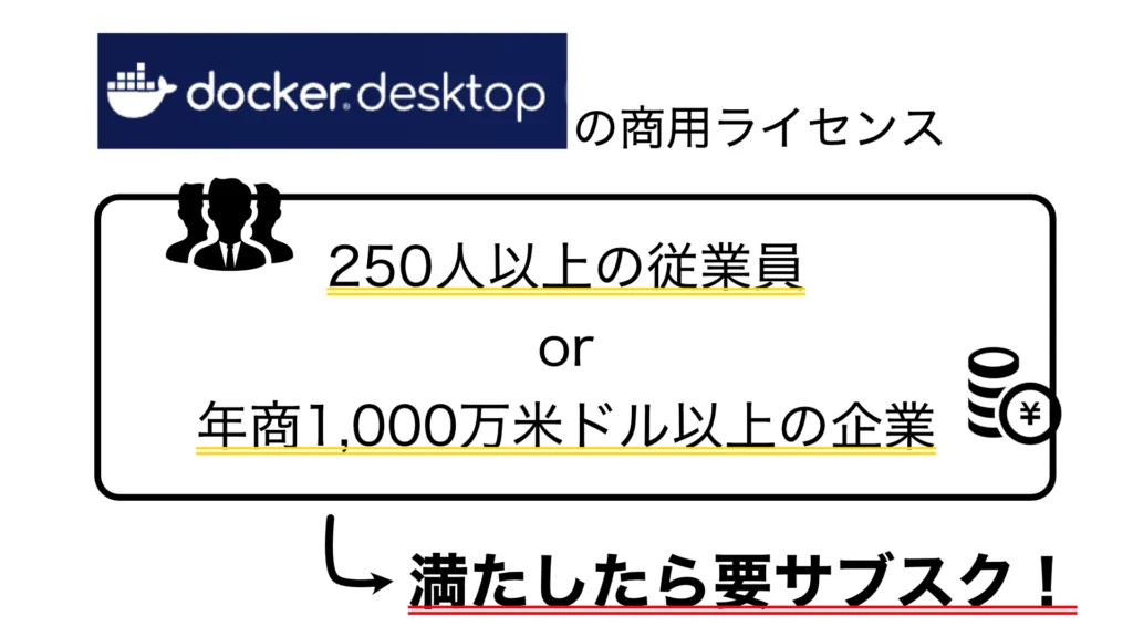 Docker Desktop は商用利用可能ですが、従業員250人以上または年商1,000万米ドル以上の企業、政府機関などで利用する場合は有料ライセンスが必要です。