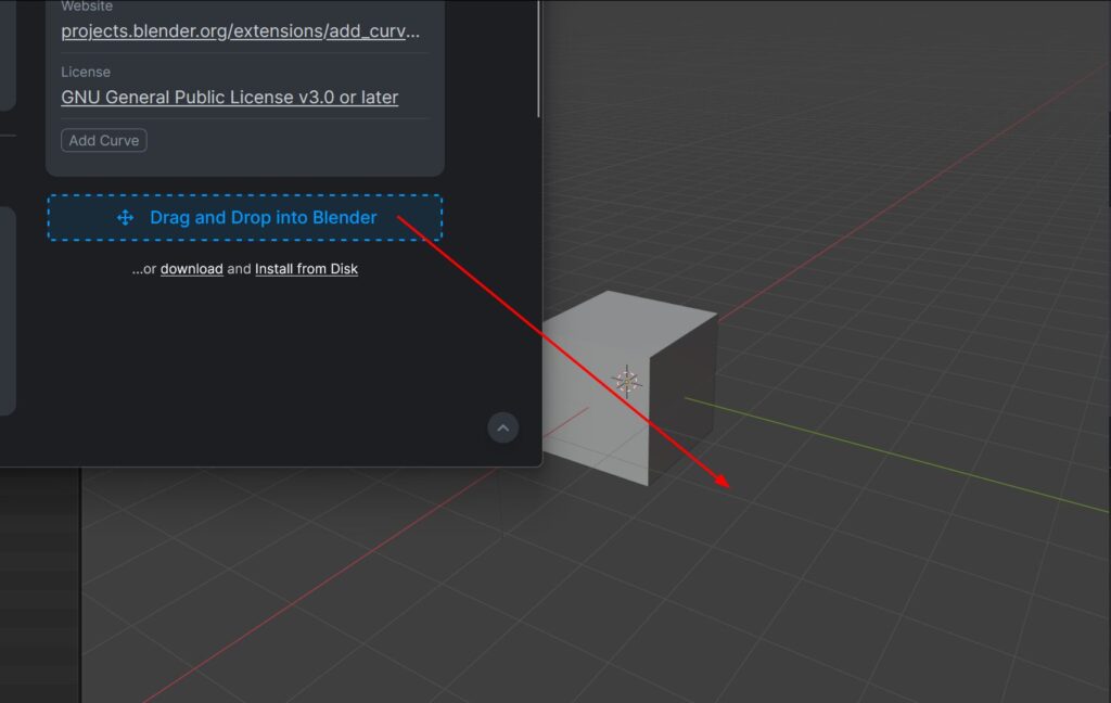 インストールしたいプラグインのあるサイトを開き、①のようにzipファイルもしくはpyファイルをつかみ、blender上にDrag&Dropします。